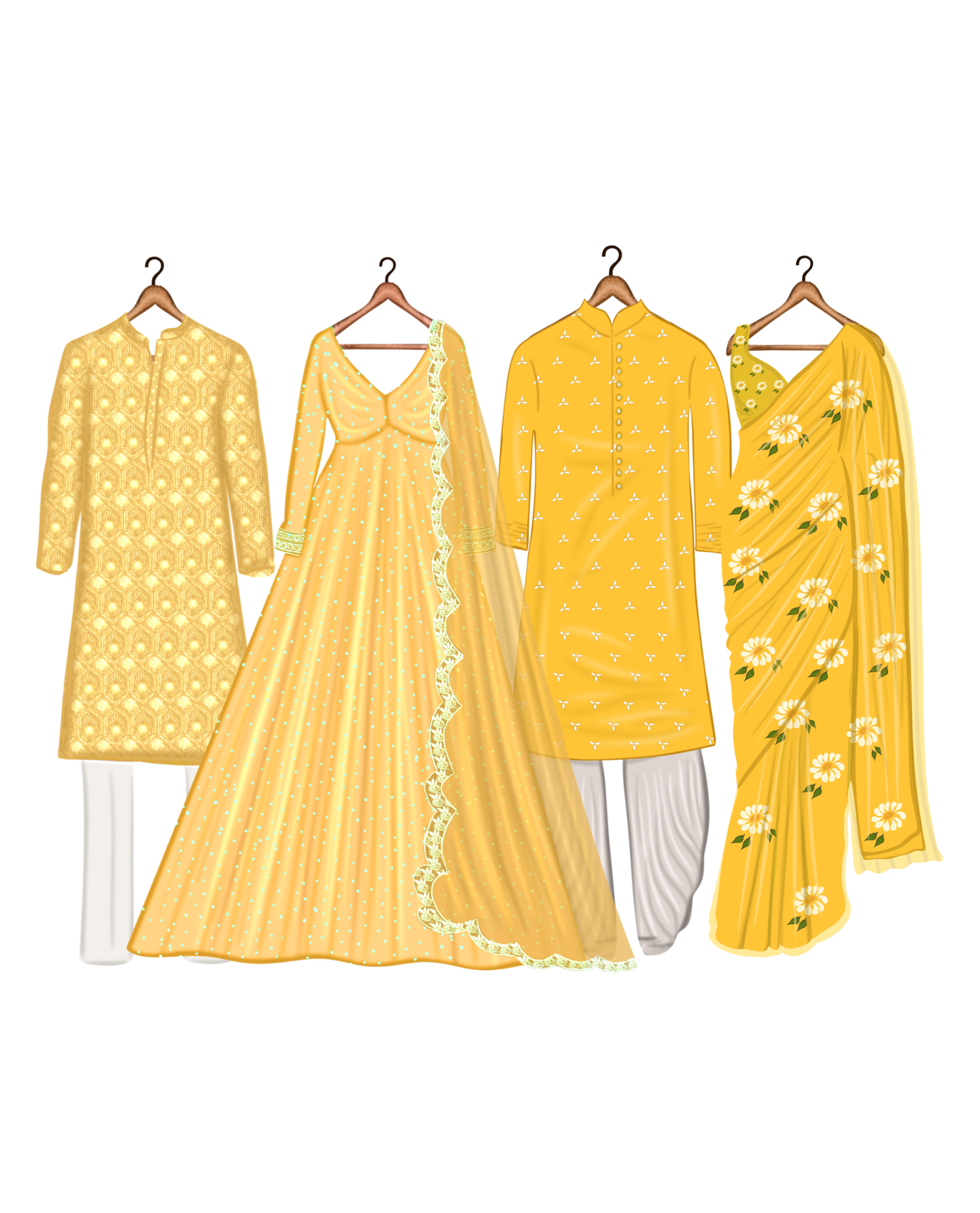 - Men: Simple Kurta Pajamas or Dhoti sets - Women: Suits, Anarkalis, or Sarees - Color Code: The Many Hues of Yellow