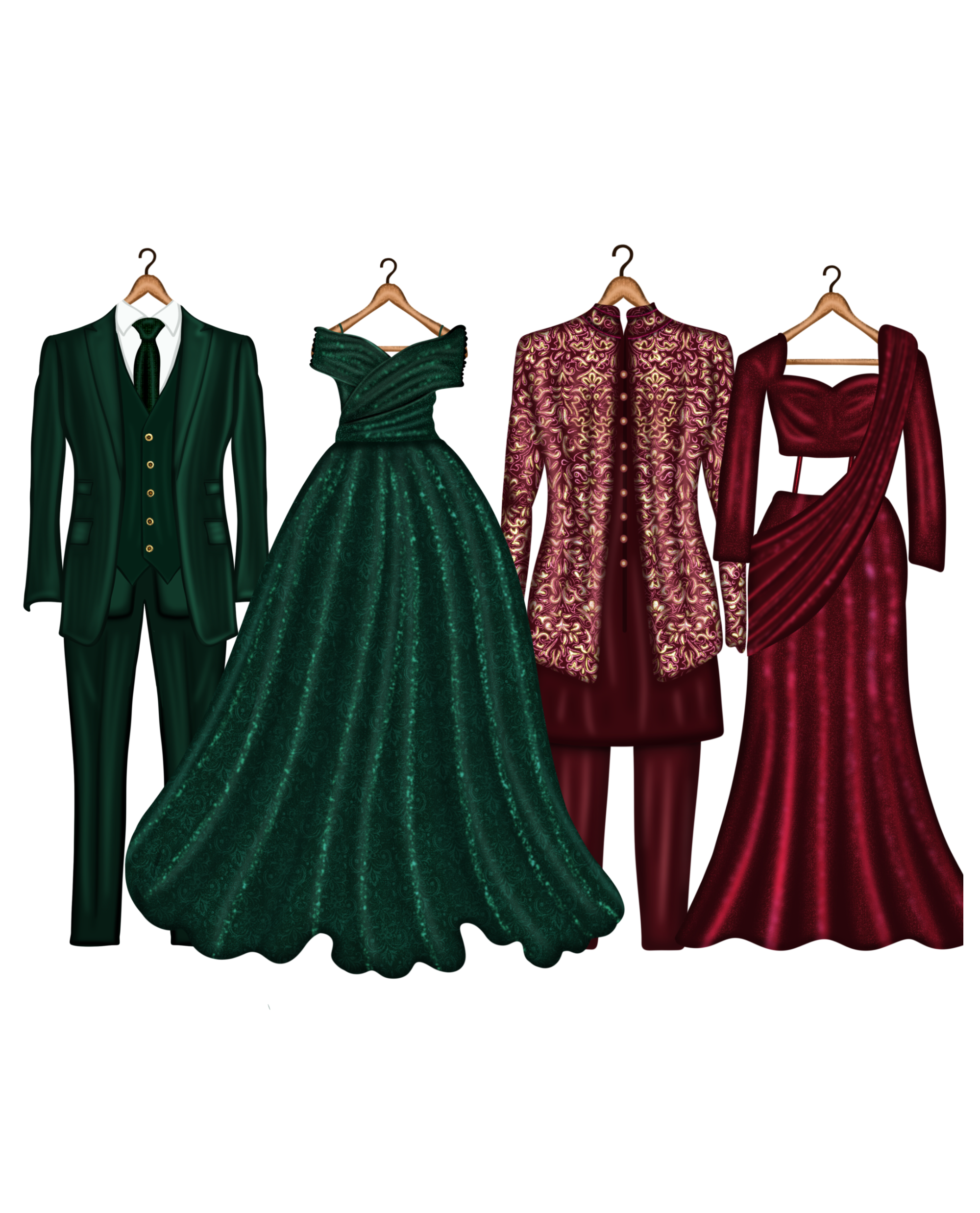 - Men: Tuxedos, Three-piece Suits, or Indo-Western outfits - Women: Designer Gowns, Sequin Sarees, or Embellished Lehengas - Color Code: Rich and regal Jewel Tones