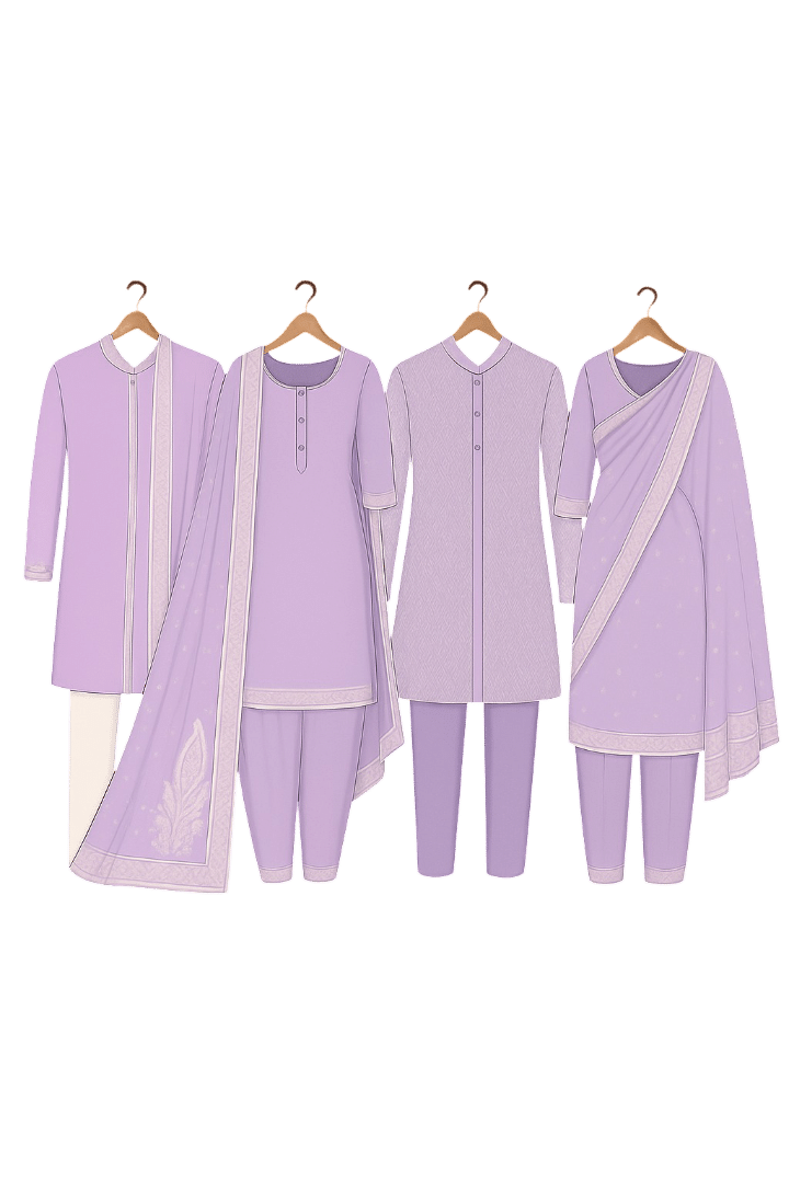 - Men: Elegant Kurta Churidar or Achkan - Women: Graceful Salwar Suits or Lehengas - Color Code: Soft Pastel Lavender